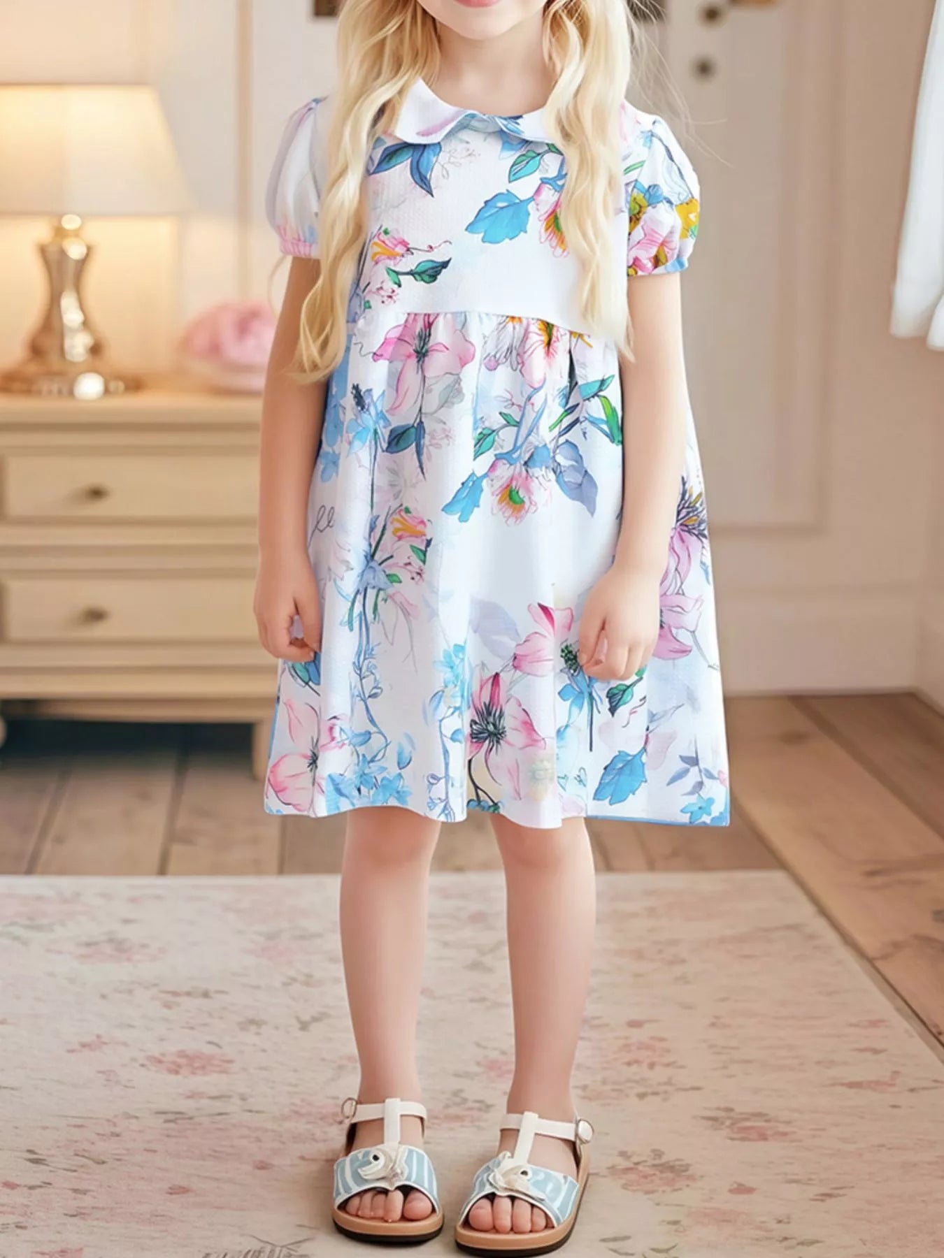 Children's Floral Print Peter Pan Collar Puff Sleeve Dress