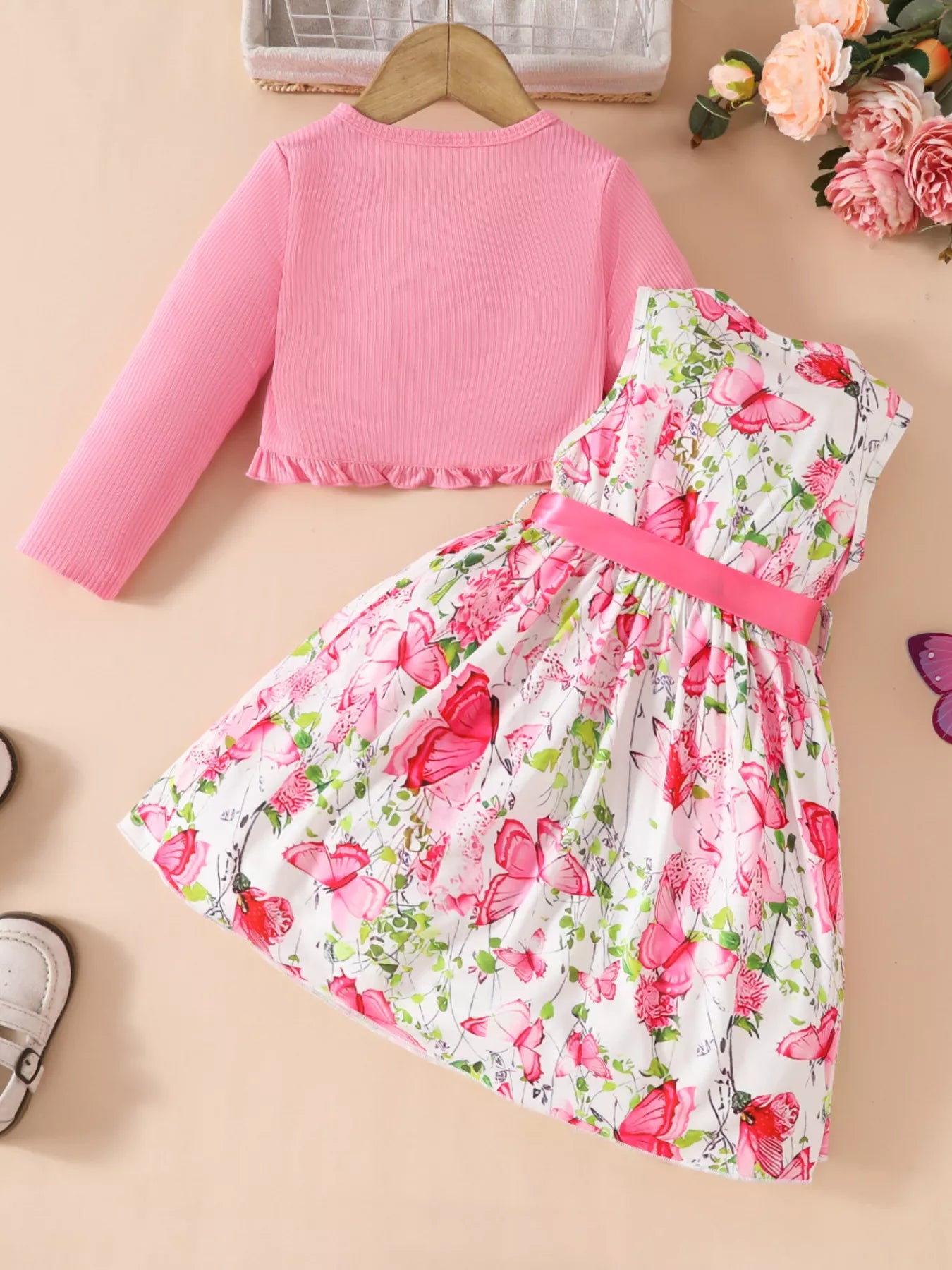 Children's Butterfly Print Sleeveless Dress with Cardigan Set